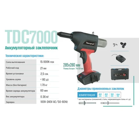 • Диаметр приминяемых заклепок: 2,4; 3,0; 3,2; 4,0; 4,8; 5,0