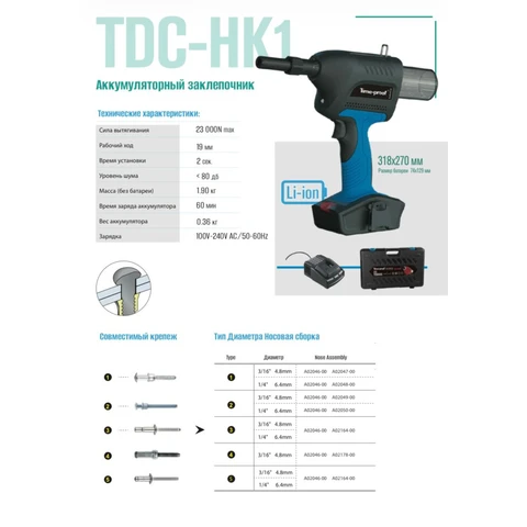 • Диаметр приминяемых заклепок: 3/16, 1/4